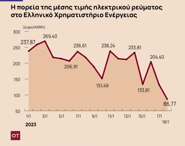 Την 1η Ιανουαρίου η μέση τιμή ήταν στα επίπεδα των 270 ευρώ ανά Μεγαβατώρα και σταδιακά αποκλιμακώνεται. Κινείται τις τελευταίες μέρες στα επίπεδα των 200 ευρώ ανά Μεγαβατώρα.