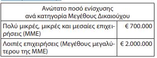 Το μέγιστο ύψος της χορηγούμενης ενίσχυσης ανά δικαιούχο προσδιορίζεται βάσει της κατηγορίας μεγέθους στην οποία εντάσσεται ως εξής: