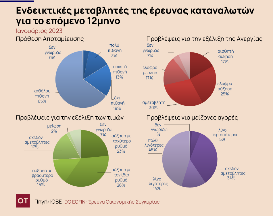 Θετικό σινιάλο στέλνουν τα στοιχεία Ιανουαρίου για τον εγχώριο πληθωρισμό (στο 7,2% από 7,6% τον Δεκέμβριο ) και για την επίτευξη του ετήσιου στόχου κάτω του 5%. Εγείρουν, όμως, ανησυχίες οι συνεχιζόμενες αυξήσεις στα τρόφιμα και η νέα άνοδος του δομικού πληθωρισμού προκαλώντας προβληματισμό για παγίωση της ακρίβειας. Τον ίδιο μήνα, ο, μέχρι τώρα, “καλός καιρός” και ο καλύτερος, από τις προβλέψεις, χειμώνας έχουν μειώσει την απαισιοδοξία στο οικονομικό και καταναλωτικό κλίμα (ΙΟΒΕ).