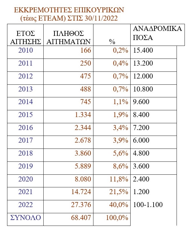 Σύμφωνα με τα επίσημα στοιχεία η συντριπτική πλειονότητα των αιτήσεων σε αναμονή, δηλαδή πάνω από το 60%, αφορά στη διετία 2021- 2022. Συνεπώς η προκαταβολή επί των αναδρομικών υπολογίζεται επί περίπου 24 μηνών.