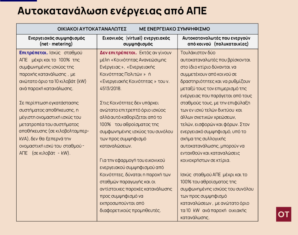 Ο «Οικονομικός Ταχυδρόμος», με τη βοήθεια του σύμβουλου του Συνδέσμου Εταιριών Φωτοβολταϊκών κ. Στέλιου Ψωμά, επιχειρεί να αποκωδικοποιήσει τη νέα νομοθετική πρωτοβουλία, διερευνώντας τις προοπτικές που ανοίγονται για αυτοπαραγωγή ρεύματος στα νοικοκυριά, στις επιχειρήσεις και στους αγρότες. Ειδικότερα, αποσαφηνίζεται ποιοι μπορούν να κάνουν ενεργειακό συμψηφισμό (net metering), εικονικό ενεργειακό συμψηφισμό (virtual net metering) και αυτοκατανάλωση με πώληση της πλεονάζουσας ενέργειας.
