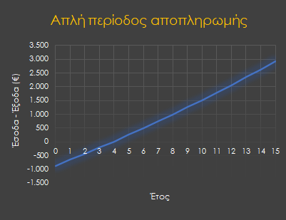 Στην 15ετία, ο καταναλωτής θα έχει ένα καθαρό όφελος 3.055 ευρώ (εξοικονόμηση ηλεκτρικής ενέργειας μείον αρχική επένδυση μείον κόστος συντήρησης) και θα αποπληρώσει το σύστημα σε 3,3 χρόνια.
