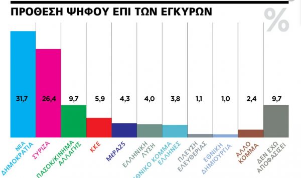Πόλος υποδοχής «αντισυστημικών» ψηφοφόρων είναι ακόμη το Εθνικό Κόμμα Ελληνες του έγκλειστου στις φυλακές Ηλία Κασιδιάρη, που κινείται ανοδικά στο 3,7% (+0,7%), παρόλο που η συμμετοχή του στις κάλπες θα κριθεί με βάση τη νέα νομοθεσία για τις εγκληματικές οργανώσεις από τον Αρειο Πάγο μετά την επίσημη προκήρυξη των εκλογών.