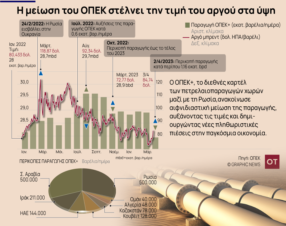 Οι οκτώ χώρες μέλη του ΟΠΕΚ+ ανακοίνωσαν ότι προχωρούν σε εθελοντική μείωση της παραγωγής, με το Ριάντ να δηλώνει ότι θα μειώσει την παραγωγή κατά 500.000 βαρέλια την ημέρα (bpd) από τον Μάιο έως το τέλος του 2023.