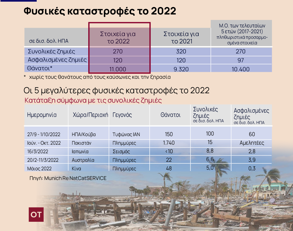 Η Munich Re, η μεγαλύτερη αντασφαλιστική εταιρεία στον κόσμο, διαπίστωσε απότομες οικονομικές απώλειες το 2022, καθώς η κλιματική κρίση οδήγησε σε περισσότερα ακραία καιρικά φαινόμενα, όπως ο τυφώνας Ίαν στις ΗΠΑ και οι πλημμύρες στο Πακιστάν. Σύμφωνα με υπολογισμούς της οι απώλειες αυτές ανήλθαν σε 270 δισ. δολάρια πέρυσι, εκ των οποίων περίπου 120 δισ. δολάρια καλύφθηκαν από ασφαλιστικές εταιρείες. Το σύνολο των ασφαλισμένων ζημιών συνεχίζει την τάση υψηλών ζημιών τα τελευταία χρόνια.