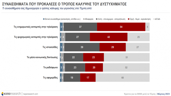 Θα πρέπει να σταθούμε ιδιαίτερα στο ακόλουθο εύρημα: το 54% δηλώνει τον θυμό ως κυρίαρχο συναίσθημα που του δημιούργησε ο τρόπος κάλυψης του δυστυχήματος στα Τέμπη από τις ενημερωτικές και 42% από τις ψυχαγωγικές εκπομπές στην τηλεόραση, εξέλιξη που ενισχύει την πόλωση ως κυρίαρχο στοιχείο του δημόσιου διαλόγου και τις προσπάθειες, αντίστοιχα, απαξίωσης των ΜΜΕ.