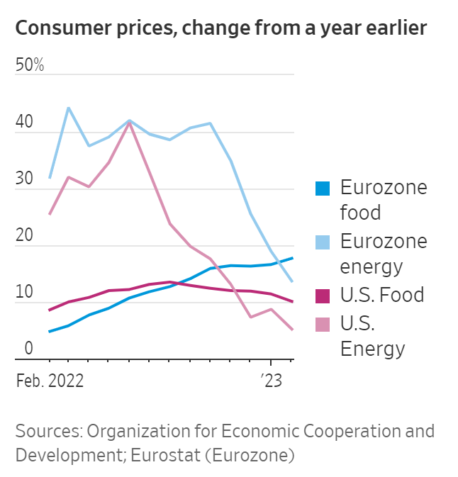 Στην Ευρωζώνη τον Μάρτιο οι τιμές των τροφίμων, του αλκοόλ και του καπνού αυξήθηκαν σε σχέση με τον αντίστοιχο μήνα το 2022 κατά 15,4%, όταν οι τιμές τη ενέργειας υποχώρησαν κατά 0,9%. Στην άλλη πλευρά του Ατλαντικού και συγκεκριμένα στις ΗΠΑ οι τιμές της ίδιας ομάδας προϊόντων σημείωσαν άνοδο 10,2%, έναντι αύξησης 5,2% της ενέργειας.