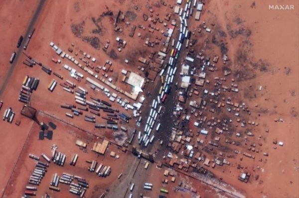 Ουρά λεωφορείων στα σύνορα του Σουδάν με την Αίγυπτο (δορυφορική εικόνα από Maxar Technologies via Reuters)
