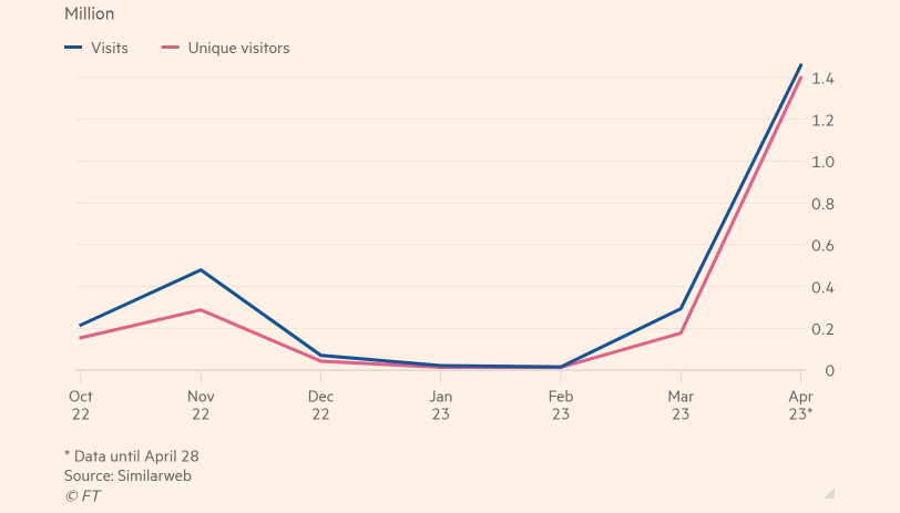 Ωστόσο, οι επισκέψεις τόσο σε laptops όσο και σε εφαρμογές για κινητά αυξήθηκαν σε σχεδόν 1,5 εκατομμύριο παγκοσμίως τον Απρίλιο, από λιγότερες από 300.000 τον Μάρτιο και περίπου 15.000 τον Φεβρουάριο, σύμφωνα με στοιχεία της ομάδας ψηφιακής νοημοσύνης Similarweb.
