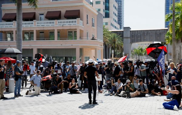 Οι οπαδοί του πρώην Αμερικανού προέδρου φωνάζουν συνθήματα υπέρ του. Στο σημείο έχουν συγκεντρωθεί ακόμα εκατοντάδες δημοσιογράφοι και φωτογράφοι από όλα τα μέσα ενημέρωσης του πλανήτη και κάποιοι επικριτές του Τραμπ.
