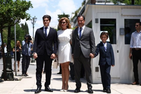 Ο νέος υπουργός Εργασίας Άδωνις Γεωργιάδης προσήλθε στο Προεδρικό Μέγαρο μαζί με την σύζυγό του Ευγενία Μανωλίδου η οποία ήταν ντυμένη στα λευκά, και τα δυο τους παιδιά.