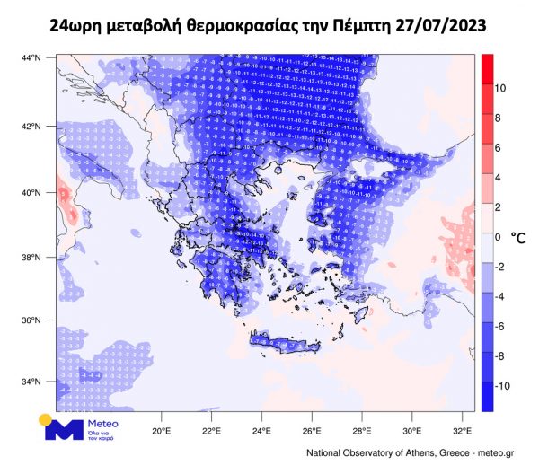 Σύμφωνα με το έκτακτο δελτίο της ΕΜΥ, την Πέμπτη 27 Ιουλίου η θερμοκρασία θα υποχωρήσει σε όλη τη χώρα τουλάχιστον κατά 8 βαθμούς και δε θα ξεπερνά τους 35 με 37 βαθμούς Κελσίου. Στη Θράκη, την ανατολική Μακεδονία, τις ανατολικές περιοχές της κεντρικής Μακεδονίας (κυρίως περιοχές της Χαλκιδικής) και το βορειοανατολικό Αιγαίο προβλέπονται καταιγίδες που θα συνοδεύονται από πολύ ενισχυμένους βόρειους ανέμους (μπουρίνια).