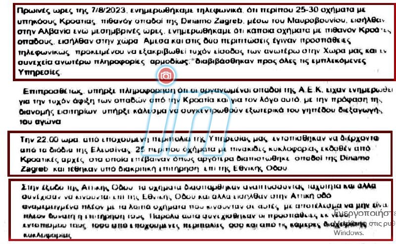 Στο έγγραφο επιβεβαιώνονται οι πληροφορίες ότι την αυτοκινητοπομπή των Κροατών χούλιγκαν «υποδέχθηκε» στα διόδια της Ελευσίνας μόνο μία υπηρεσιακή μοτοσυκλέτα της εν λόγω αρμόδιας υπηρεσίας της Ελληνικής Αστυνομίας, καθότι κρίθηκε ότι δεν υπήρχε επαρκής χρόνος για να στηθεί «μπλόκο» από ισχυρότερες αστυνομικές δυνάμεις ώστε να υπήρχε έστω και στην τελική φαση της πορείας τους, ελεγχος στους Κροάτες χούλιγκαν.