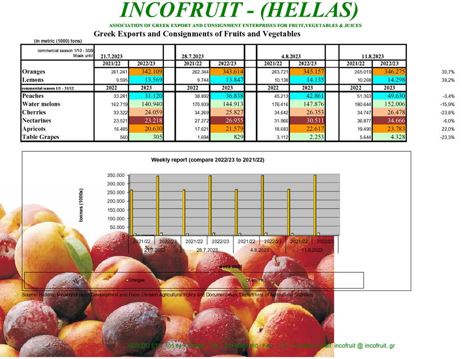 Επίσης, η εξαγωγή πορτοκαλιών από 1/9/22 έως 11/8/23 ανέρχονται σε 346.275 τόνους (αύξηση κατά 30,7%) έναντι 265.019 τόνων το 2021/22.