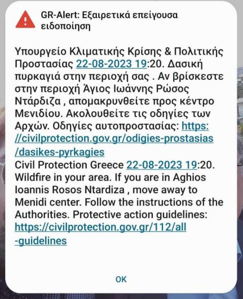Υπουργείο Κλιματικής Κρίσης και Πολιτικής Προστασίας. Δασική πυρκαγιά στην περιοχή σας. Εάν βρίσκεστε στη Φυλή απομακρυνθείτε προς Άνω Λιόσια. Ακολουθείτε τις οδηγίες των Αρχών.