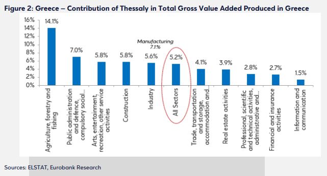 Οι αναλυτές της Eurobank τονίζουν ότι «μια ακριβής εκτίμηση των επιπτώσεων των πλημμυρών στη Θεσσαλία στα μακροοικονομικά μεγέθη της ελληνικής οικονομίας είναι επί του παρόντος πολύ δύσκολη, δεδομένου ότι ούτε το μέγεθος των ζημιών ούτε αυτό των μέτρων δημοσιονομικής στήριξης (καθώς και η σύνθεσή τους και ο χρόνος έναρξης εφαρμογής τους) μπορούν να υποτεθούν με αξιοπιστία». Ωστόσο, όπως σημειώνουν, μια αξιόπιστη προσέγγιση προσφέρει το γεγονός ότι η περιφέρεια Θεσσαλίας συνεισφέρει το 5,2% της συνολικής Ακαθάριστης Προστιθέμενης Αξίας που παράγεται στην Ελλάδα (και το 6,4% της συνολικής απασχόλησης). Από αυτό το μερίδιο, το 13,0% προέρχεται από τη γεωργία, τη δασοκομία και την αλιεία και το 13,4% από την τη μεταποίηση, δηλαδή τους δύο τομείς με τις μεγαλύτερες απώλειες λόγω των πλημμυρών. Εκτιμάται ότι περίπου το 23% της γης που χρησιμοποιείται για γεωργία και βιομηχανία στη Θεσσαλία έχει πλημμυρίσει. «Ως εκ τούτου, η περίμετρος της ετήσιας απώλειας παραγωγής σε αυτούς τους δύο τομείς είναι 0,7 δισ. ευρώ σε τιμές αγοράς».