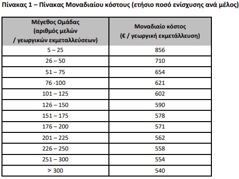 α) του μοναδιαίου κόστους (ετήσιου ποσού ενίσχυσης ανά μέλος) που αντιστοιχεί στο μέγεθος ομάδας (όπως διευκρινίζεται στο σημ. 2 παρακάτω) του υποψήφιου φορέα, σύμφωνα με τον πίνακα που ακολουθεί, επί