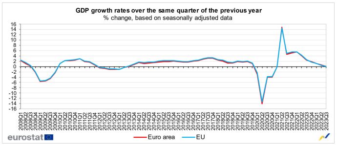 Οριακά σε αρνητικό έδαφος κινήθηκε η ανάπτυξη στην ευρωζώνη το τρίτο τρίμηνο του 2023, έναντι ανάπτυξης 0,1% στην Ευρωπαϊκή Ένωση σε σύγκριση με το δεύτερο τρίμηνο, όταν κατέγραψε οριακή αύξηση κατά 0,2% στην ευρωζώνη, μετά την τεχνική ύφεση του πρώτου τριμήνου με -0,1%.