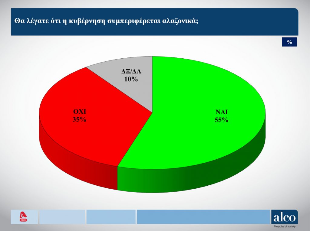 Αλαζονεία αποδίδει στην κυβέρνηση παραπάνω από 50% των πολιτών σε νέα δημοσκόπηση της Alco που παρουσιάστηκε σήμερα στον Alpha.