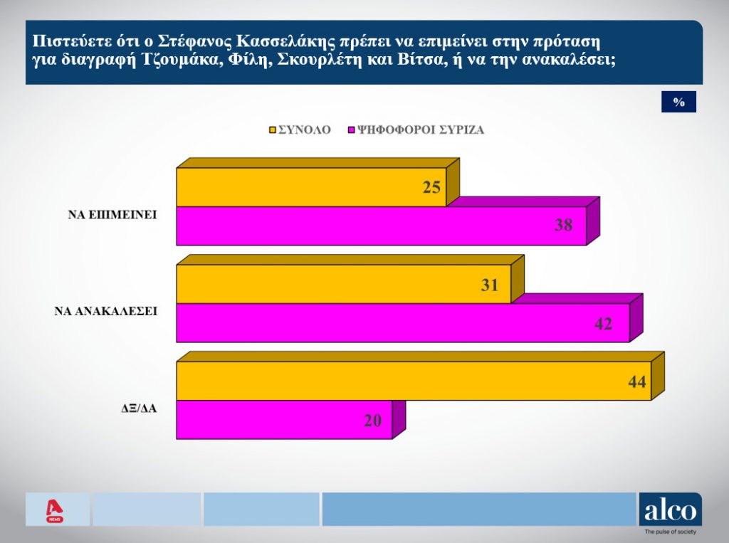 Στο σύνολο των ψηφοφόρων, το 25% θέλει να διαγραφούν τα τέσσερα στελέχη, το 31% να ανακαλέσει ο πρόεδρος του ΣΥΡΙΖΑ-ΠΣ και το 44% δεν απαντά.