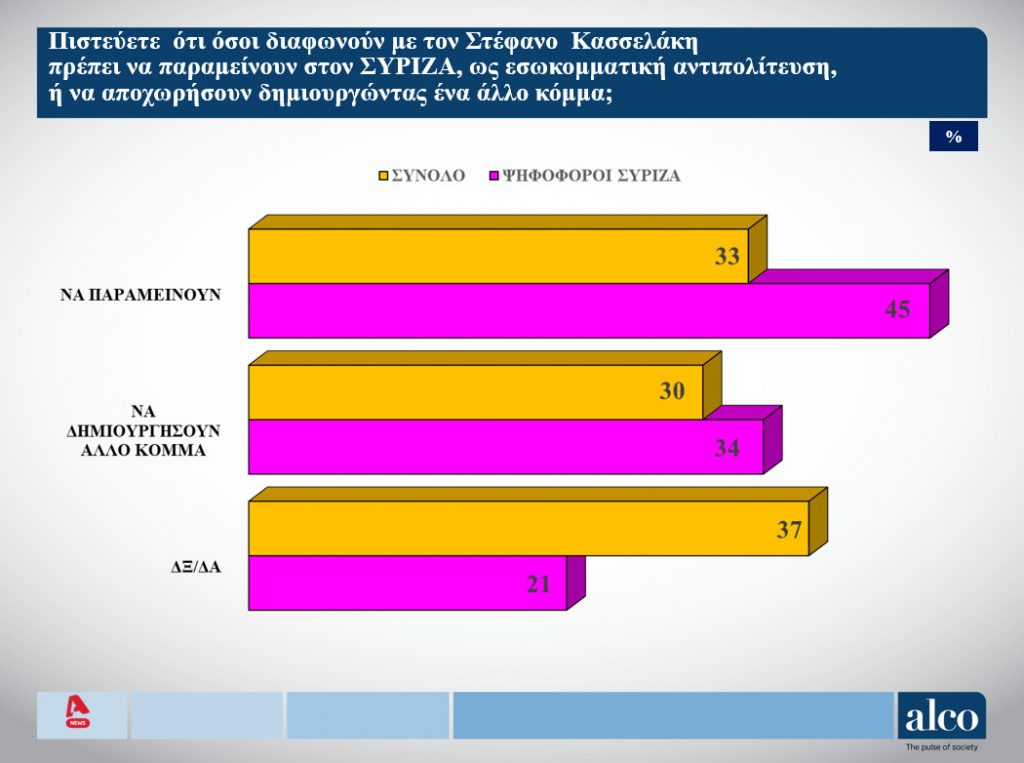 Στο σύνολο των ψηφοφόρων το 33% εκτιμά ότι τα τέσσερα στελέχη πρέπει να παραμείνουν, το 30% πως πρέπει να δημιουργήσουν νέο κόμμα, ενώ, το 37% απαντά «δεν ξέρω/δεν απαντώ».