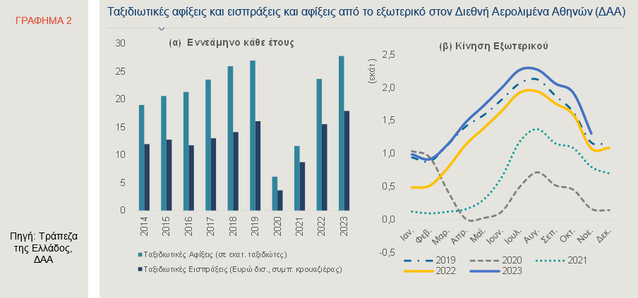 Για το σύνολο του 2023, ο ρυθμός οικονομικής μεγέθυνσης εκτιμάται ότι θα υπερβεί το 2%. Το τελευταίο αντανακλάται στην εξέλιξη των βραχυχρόνιων δεικτών οικονομικής συγκυρίας, όπως οι πωλήσεις Ι.Χ. επιβατικών αυτοκινήτων, οι οποίες καταγράφουν σημαντική αύξηση κατά 15,8% σε ετήσια βάση, το πρώτο δεκάμηνο του έτους. Επιπρόσθετα, σε ό,τι αφορά στον τουρισμό, το πρώτο εννεάμηνο του έτους οι διεθνείς ταξιδιωτικές αφίξεις και εισπράξεις (συμπ. κρουαζιέρας) διαμορφώθηκαν σε 27,8 εκατ. και Ευρώ 17,9 δισ. (Γράφημα 2α), καταγράφοντας ετήσια αύξηση κατά 17,3% και 15,2%, ενώ υπερβαίνουν τις αντίστοιχες επιδόσεις του 2019 κατά 3,1% και 11,3%, αντίστοιχα. Οι εκτιμήσεις για το τελευταίο τρίμηνο του έτους είναι θετικές, καθώς τον Οκτώβριο και τον Νοέμβριο η επιβατική κίνηση από το εξωτερικό στον Διεθνή Αερολιμένα Αθηνών ήταν αυξημένη κατά περίπου 21% σε ετήσια βάση και κατά 18% και 12% σε σύγκριση με τον Οκτώβριο και τον Νοέμβριο του 2019, αντίστοιχα (Γράφημα 2β). Επιπρόσθετα, σύμφωνα με τα στοιχεία της Fraport, τον Οκτώβριο η διεθνής επιβατική κίνηση στα περιφερειακά αεροδρόμια της χώρας κατέγραψε ετήσια αύξηση κατά 7,3%, υπερβαίνοντας την αντίστοιχη επίδοση του Οκτωβρίου του 2019 κατά 23,3%. Το γεγονός αυτό αφενός ενισχύει την εκτίμηση ότι το 2023 θα αποτελέσει έτος ορόσημο για τον ελληνικό τουρισμό, ξεπερνώντας τις ιστορικά υψηλές επιδόσεις του 2019 και αφετέρου υποδηλώνει ότι ο τουρισμός, ο οποίος αποτελεί βαρόμετρο για την ελληνική οικονομία, θα συμβάλει και το τέταρτο τρίμηνο στην άνοδο της οικονομικής δραστηριότητας.