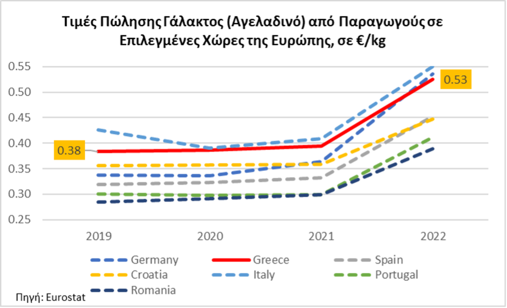 * Η τιμή του αγελαδινού γάλακτος σε επίπεδο παραγωγού αυξήθηκε από 0,39 ευρώ/kg το 2021 σε 0,53 ευρώ/kg το 2022, ή κατά 33%