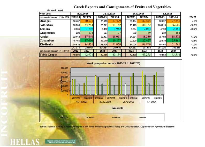 Αυξημένες κατά 13,6% είναι οι εξαγωγές ακτινιδίων, οι οποίες από 1/9/2023 έως και 5/1/2024 ανέρχονται σε 101.561 τόνους έναντι 89.166 τόνων το αντίστοιχο διάστημα 2022/23.