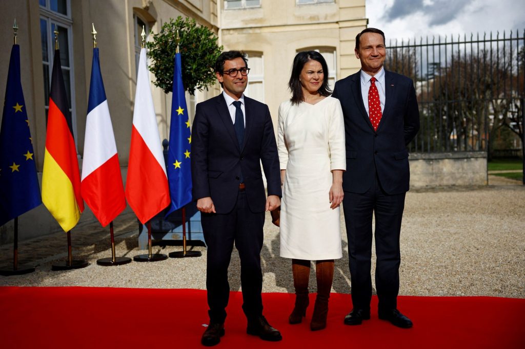 Οι υπουργοί Εξωτερικών της Γαλλίας, της Γερμανίας και της Πολωνίας (από τα αριστερά προς τα δεξιά) κατά τη συνάντηση που είχαν στις 12 Φεβρουαρίου έξω από το Παρίσι (REUTERS/Sarah Meyssonnier/Pool)