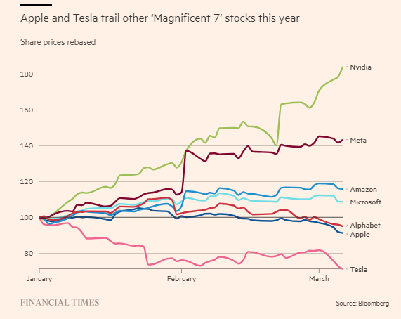 Εκτός των ΗΠΑ, η Κίνα είναι η μεγαλύτερη αγορά της Apple και της Tesla, συνεισφέροντας αντίστοιχα το 19% και το 22% των συνολικών εσόδων κατά τα πιο πρόσφατα οικονομικά τους έτη. Οι αυξανόμενες προκλήσεις τους στη χώρα έχουν τραβήξει την προσοχή της Wall Street, συμβάλλοντας στην πτώση της τιμής της μετοχής της Apple κατά 9% φέτος και στην πτώση 28% της Tesla, καθιστώντας τις τις φτωχότερες επιδόσεις μεταξύ των λεγόμενων τεχνολογικών μετοχών Magnificent Seven.