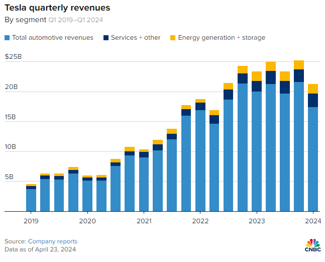 Η πτώση των πωλήσεων ήταν ακόμη πιο απότομη από την τελευταία πτώση της εταιρείας το 2020, η οποία οφειλόταν στη διακοπή της παραγωγής κατά τη διάρκεια της πανδημίας Covid-19. Τα έσοδα της Tesla από την αυτοκινητοβιομηχανία μειώθηκαν κατά 13% σε ετήσια βάση στα 17,38 δισ. δολάρια τους πρώτους τρεις μήνες του 2024.