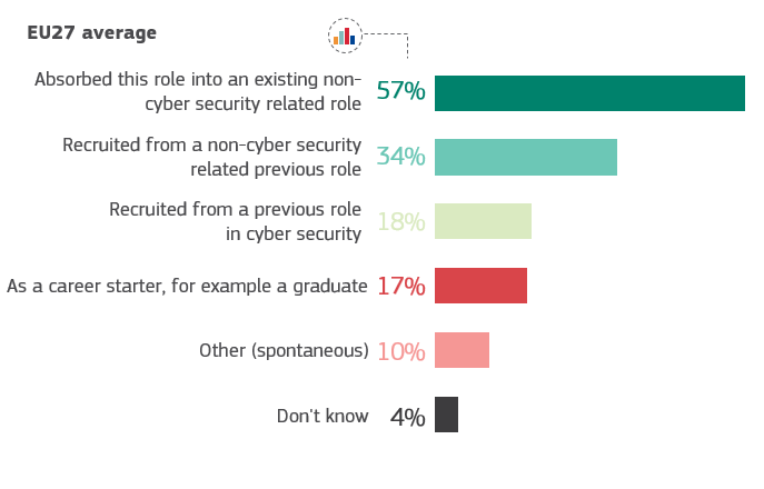 Το 76 % των εργαζομένων σε ρόλους που σχετίζονται με την κυβερνοασφάλεια δεν διαθέτουν επίσημα προσόντα ή πιστοποιημένη κατάρτιση. Το 34 % ανέλαβε τον ρόλο από ρόλο που δεν σχετίζεται με τον κυβερνοχώρο, ενώ το 57 % απορρόφησε τις αρμοδιότητες κυβερνοασφάλειας σε υφιστάμενο ρόλο.