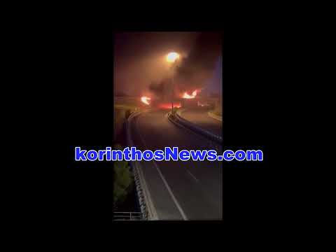 Μια από τις εκρήξεις κατάγραψε η κάμερα του korinthostv, ενώ με τον ρεπόρτερ να επισημαίνει πως στο σημείο όπου βρισκόταν υπήρχε ένα αυλάκι, στο οποίο κυλούσαν τα καύσιμα από το βυτιοφόρο. Ελάχιστα λεπτά μετά σημειώνεται μια τρομακτική έκρηξη.