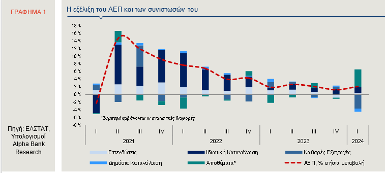 Η σημαντική συμβολή της ιδιωτικής κατανάλωσης αντανακλάται στην πορεία ορισμένων δεικτών καταναλωτικής ζήτησης από την αρχή του έτους, όπως οι πωλήσεις ΙΧ αυτοκινήτων και η καταναλωτική πίστη. Οι παράγοντες που εκτιμάται ότι θα τροφοδοτήσουν την ισχυρή συμβολή της κατανάλωσης το 2024 είναι η άνοδος της απασχόλησης, η αποκλιμάκωση του πληθωρισμού, η πρόσφατη μείωση των βασικών επιτοκίων της Ευρωπαϊκής Κεντρικής Τράπεζας και οι επιδόσεις του τουρισμού, βάσει των θετικών ενδείξεων που υπάρχουν.