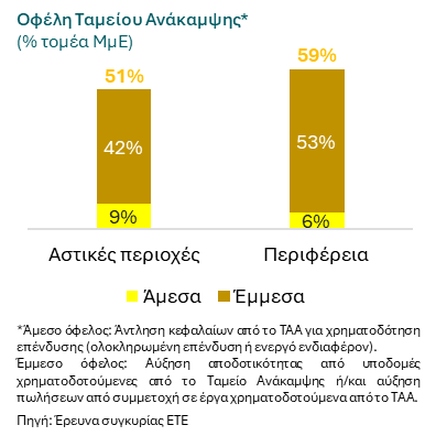 Ωστόσο, εξαιρετικής σημασίας είναι το γεγονός ότι ένα επιπλέον 45% του τομέα εκτιμά ότι θα έχει δευτερογενείς ωφέλειες. Αυτές αφορούν είτε i) αυξημένες πωλήσεις λόγω συνεργειών από έργα ή επενδύσεις χρηματοδοτούμενες από το Ταμείο, είτε ii) αυξημένη αποδοτικότητα εξαιτίας νέων υποδομών που υλοποιούνται μέσω του Ταμείου. Σημειώνεται ότι τα οφέλη των χρηματοδοτικών προγραμμάτων φαίνεται να διαχέονται σε εντονότερο βαθμό σε επιχειρήσεις της περιφέρειας, όπου 62% των ΜμΕ δηλώνουν συνολικά θετικές επιδράσεις (έναντι 50-55% σε Αθήνα και Θεσσαλονίκη), συμβάλλοντας έτσι στην ισόρροπη κατανομή της οικονομικής ανάπτυξης.