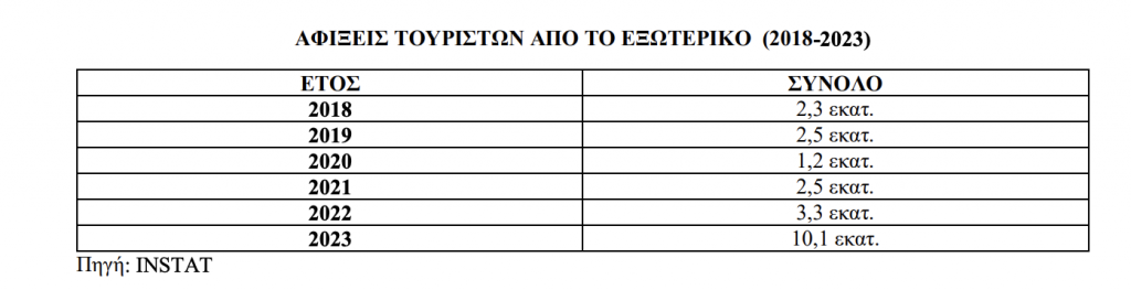 Το 2023 αποτέλεσε την πιο επιτυχημένη χρονιά για τον αλβανικό τουριστικό κλάδο, καθώς σύμφωνα με τα στοιχεία της INSTAT, οι ξένες αφίξεις έφτασαν τα 10,1 εκατ. ξεπερνώντας έτσι το ρεκόρ του προηγούμενου έτους (7,5 εκατ.). Το κλίμα ευφορίας συνεχίζεται και για το 2024 δεδομένων των συνεχώς αυξανόμενων ροών. Την περίοδο Ιανουαρίου-Μαΐου 2024 οι ξένες αφίξεις στην Αλβανία έφτασαν τις 3,3 εκατ., έναντι 2,4 το αντίστοιχο διάστημα του 2023.