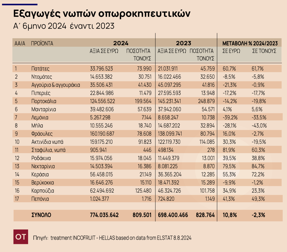 Σύμφωνα με τα τελευταία στοιχεία της ΕΛΣΤΑΤ, τα οποία επεξεργάστηκε Σύνδεσμος Ελληνικών Επιχειρήσεων Εξαγωγής Διακίνησης Φρούτων Λαχανικών και Χυμών Incofruit Hellas, η αξία των εξαγωγών πρώτο εξάμηνο 2024 έφτασε το 1,017.29 δισ. ευρώ ενώ οι ποσότητες τους 996,8 χιλιάδες τόνους.