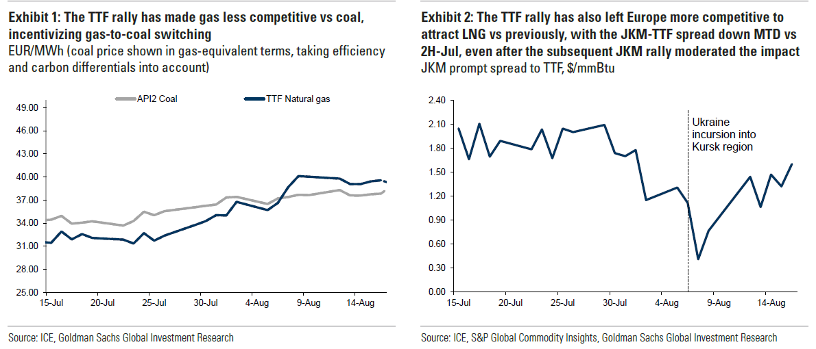 Δεύτερον, ενώ δεν υπήρξε απώλεια προσφοράς αγωγών, όσο περισσότερο διατηρούνται αυτές οι υψηλότερες ευρωπαϊκές τιμές φυσικού αερίου σε σχέση με τις τιμές του ευρωπαϊκού άνθρακα και του LNG της Ασίας, τόσο χαμηλότερη είναι η ζήτηση φυσικού αερίου (λόγω της μεταφοράς) και τις υψηλότερες (δυνητικά) ευρωπαϊκές εισαγωγές LNG, ειδικά εάν το συνεχιζόμενο κύμα καύσωνα στη Βορειοανατολική Ασία υποχωρήσει, συμβάλλοντας στην άμβλυνση των προοπτικών για το ευρωπαϊκό φυσικό αέριο.
