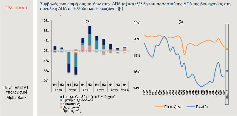 Το μερίδιο της βιομηχανίας στη συνολική ΑΠΑ, ωστόσο, εξακολουθεί να υπολείπεται του μέσου όρου της Ευρωζώνης (α’ εξάμηνο 2024: 18,8%), σύμφωνα με την ανάλυση της Alpha Bank.