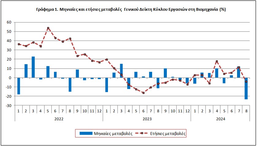 Ο Γενικός Δείκτης Κύκλου Εργασιών στη Βιομηχανία του μηνός Αυγούστου 2024, σε σύγκριση με τον αντίστοιχο δείκτη του Ιουλίου 2024, παρουσίασε μείωση 23,6%.
