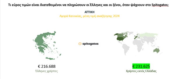 Ένα ακόμη σημαντικό «εργαλείο» του Spitogatos είναι η δυνατότητα να αναλυθεί τι ψάχνουν οι πολίτες που κατοικούν στην Ελλάδα σε σχέση με αυτούς στο εξωτερικό. Έτσι το 2024 οι ξένοι ήταν διατεθειμένοι να επενδύσουν κατά μέσο όρο 231.625 Ευρώ για αγορά κατοικίας στην Αττική, σε σχέση με τα 216.688 Ευρώ των Ελλήνων.