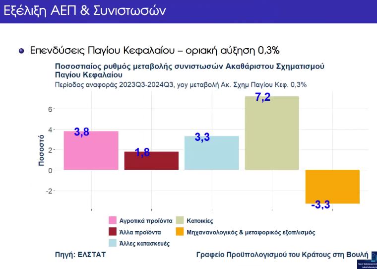 – Το Ακαθάριστο Εγχώριο Προϊόν (ΑΕΠ) παρουσίασε αύξηση 2,4% το τρίτο τρίμηνο του 2024 σε σχέση με το τρίτο τρίμηνο του 2023 (προσωρινά στοιχεία της ΕΛΣΤΑΤ), ενώ το αντίστοιχο μέγεθος στην Ευρωζώνη είναι 0,9%. Σε αυτή την επίδοση συνετέλεσαν η αύξηση της ιδιωτικής κατανάλωσης (2,1%) που εξακολουθεί να παρουσιάζει ανθεκτικότητα και η αύξηση των εξαγωγών αγαθών και υπηρεσιών (3,3% συνολικά, 5,1% για υπηρεσίες και 1,2% για αγαθά). Είναι αξιοσημείωτη η αύξηση των καταθέσεων των νοικοκυριών και επιχειρήσεων με βάση τα στοιχεία της Τράπεζας της Ελλάδος, οι οποίες αυξήθηκαν από 132.9 εκατ. ευρώ τον Ιανουάριο του 2019 (αρχή της περιόδου για την οποία υπάρχουν διαθέσιμα στοιχεία) σε 195.5 εκατ. ευρώ τον Οκτώβριο 2024 (τελευταίος μήνας διαθεσιμότητας στοιχείων), μία αύξηση 47,1%. Οι επενδύσεις παγίου κεφαλαίου αυξήθηκαν κατά 0,3%. Αρνητική ήταν η συμβολή της δημόσιας κατανάλωσης (-1,4%) και των εισαγωγών αγαθών και υπηρεσιών (αύξηση 4,2% συνολικά).