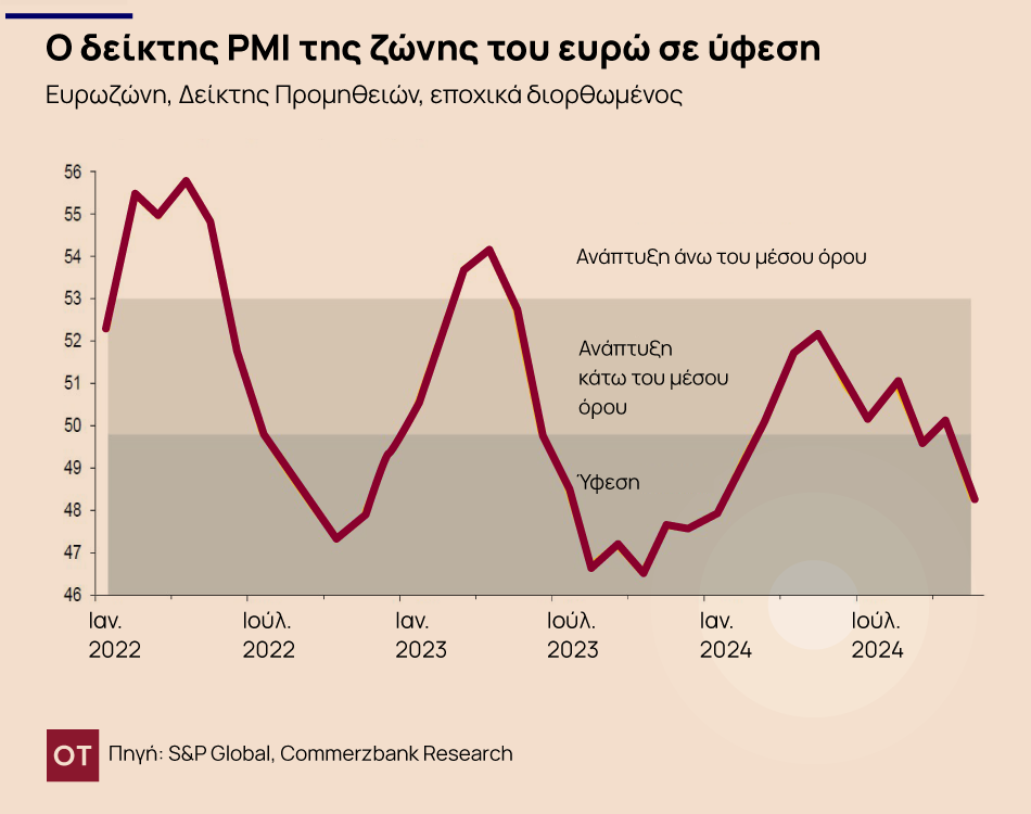Ως εκ τούτου, δεν μπορεί να αποκλειστεί ότι η οικονομία της ευρωζώνης θα διολισθήσει σε ύφεση πριν ανακάμψει. Σε τελική ανάλυση, υπάρχουν πολλοί πιθανοί αρνητικοί παράγοντες: η ασθενής ζήτηση από την Κίνα, η απειλή των αμερικανικών δασμών στις εισαγωγές από την Ευρώπη και η επείγουσα ανάγκη εξυγίανσης των δημόσιων οικονομικών σε ορισμένες χώρες της ευρωζώνης, όπως η Γαλλία και η Ιταλία.