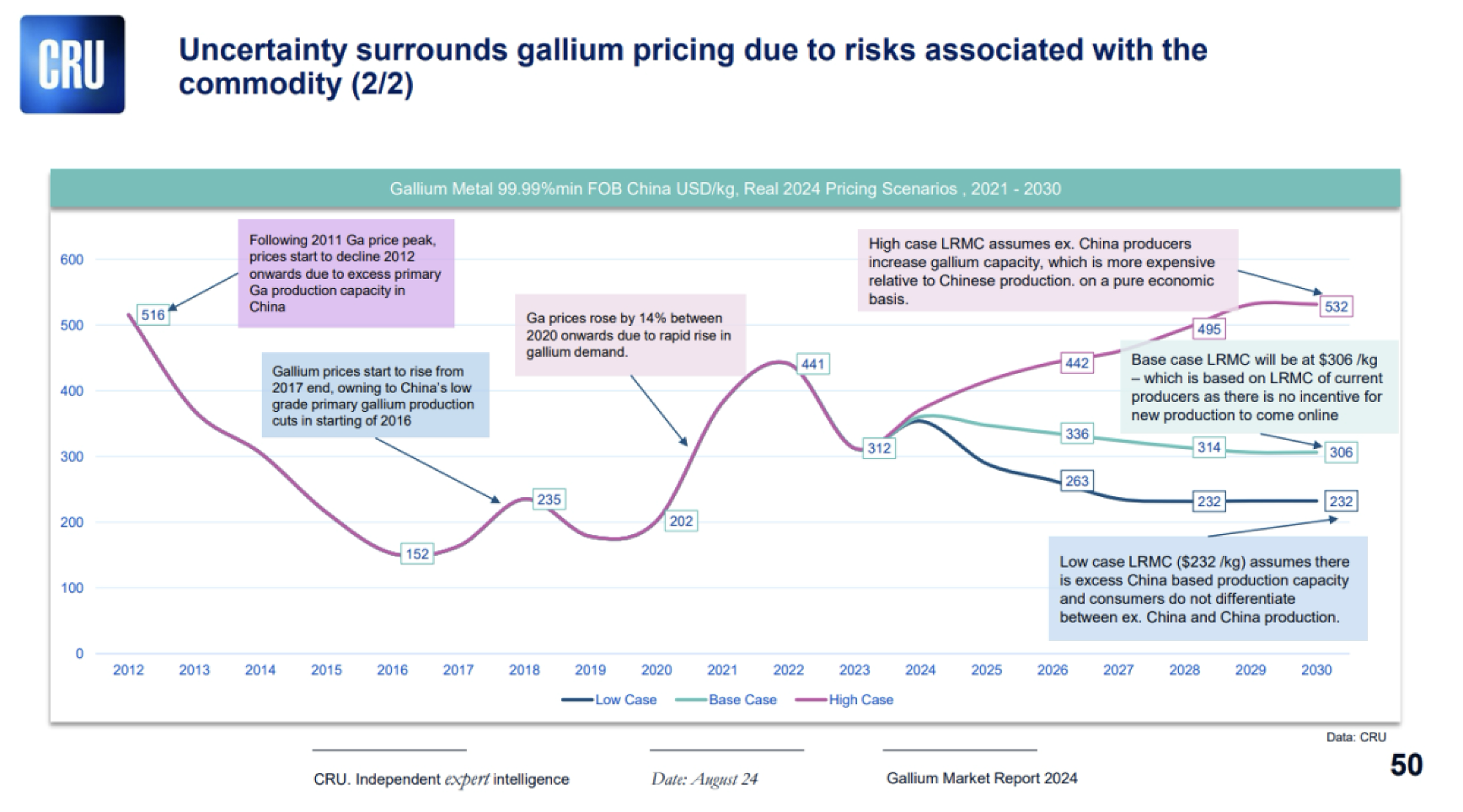 Γράφημα με ιστορική κίνηση τιμών γαλλίου από το 2012 και πρόβλεψη πορείας τιμής έως το 2030