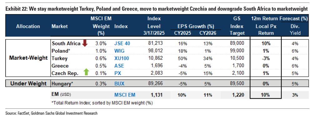 Κατά την Goldman Sachs, παρά τους βραχυπρόθεσμους κινδύνους από τους δασμούς, οι αναδυόμενες αγορές της Ευρώπης εξακολουθούν να είναι πιο φθηνές και διαπραγματεύονται με discount 35% έναντι αυτών στον MSCI EM (έναντι μακροπρόθεσμου μέσου discount 10%), υποδηλώνοντας περιθώρια για περαιτέρω ανοδική πορεία, σε περίπτωση διαρκών δημοσιονομικών αλλαγών και χαλάρωσης της πολιτικής αβεβαιότητας.