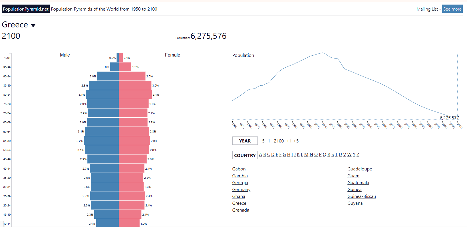 Σύμφωνα με τα γραφήματα του populationpyramid.net, τα οποία αντλούν πληροφορίες από επίσημες μελέτες -όπως εκείνες των Ηνωμένων Εθνών- ο πληθυσμός της Ελλάδας το 2100 θα είναι λίγο παραπάνω από 6.200.000.