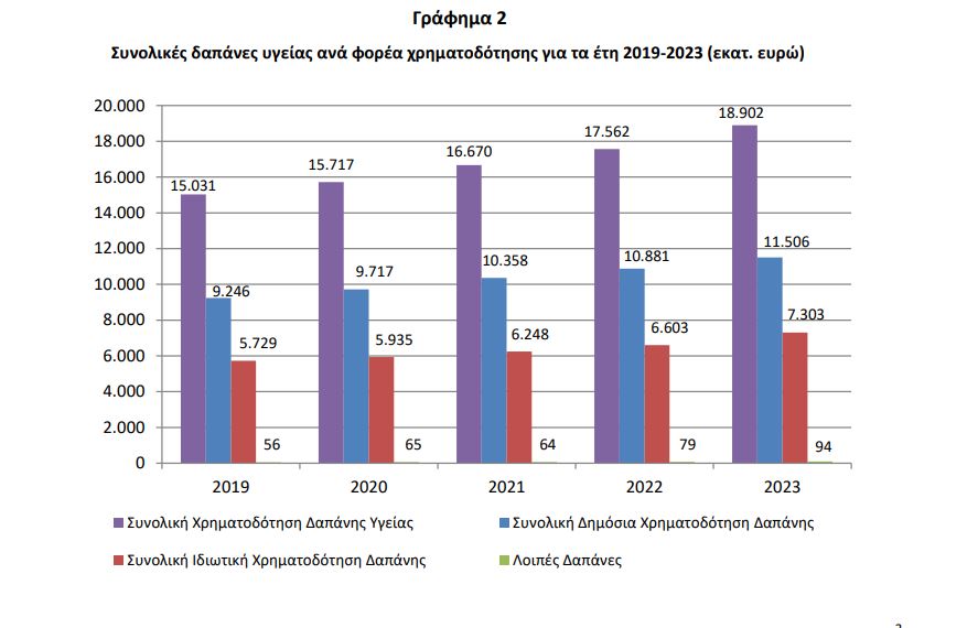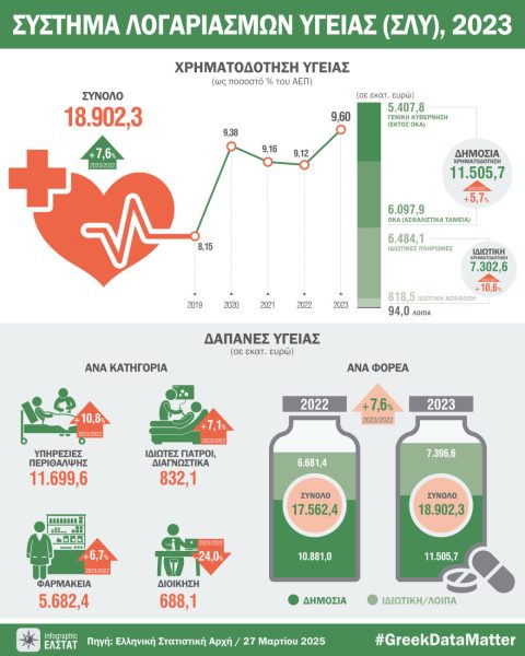 Συνολικά οι δαπάνες υγείας στην Ελλάδα ανήλθαν το 2023 στο 9,60% του ΑΕΠ ή 18,9 δις. ευρώ. Από αυτά τα 11,5 δισ. προήλθαν από το δημόσιο – με 5,4 δισ. από τη γενική κυβέρνηση και σχεδόν 6,1 δισ. από τους Οργανισμούς Κοινωνικής Ασφάλισης.