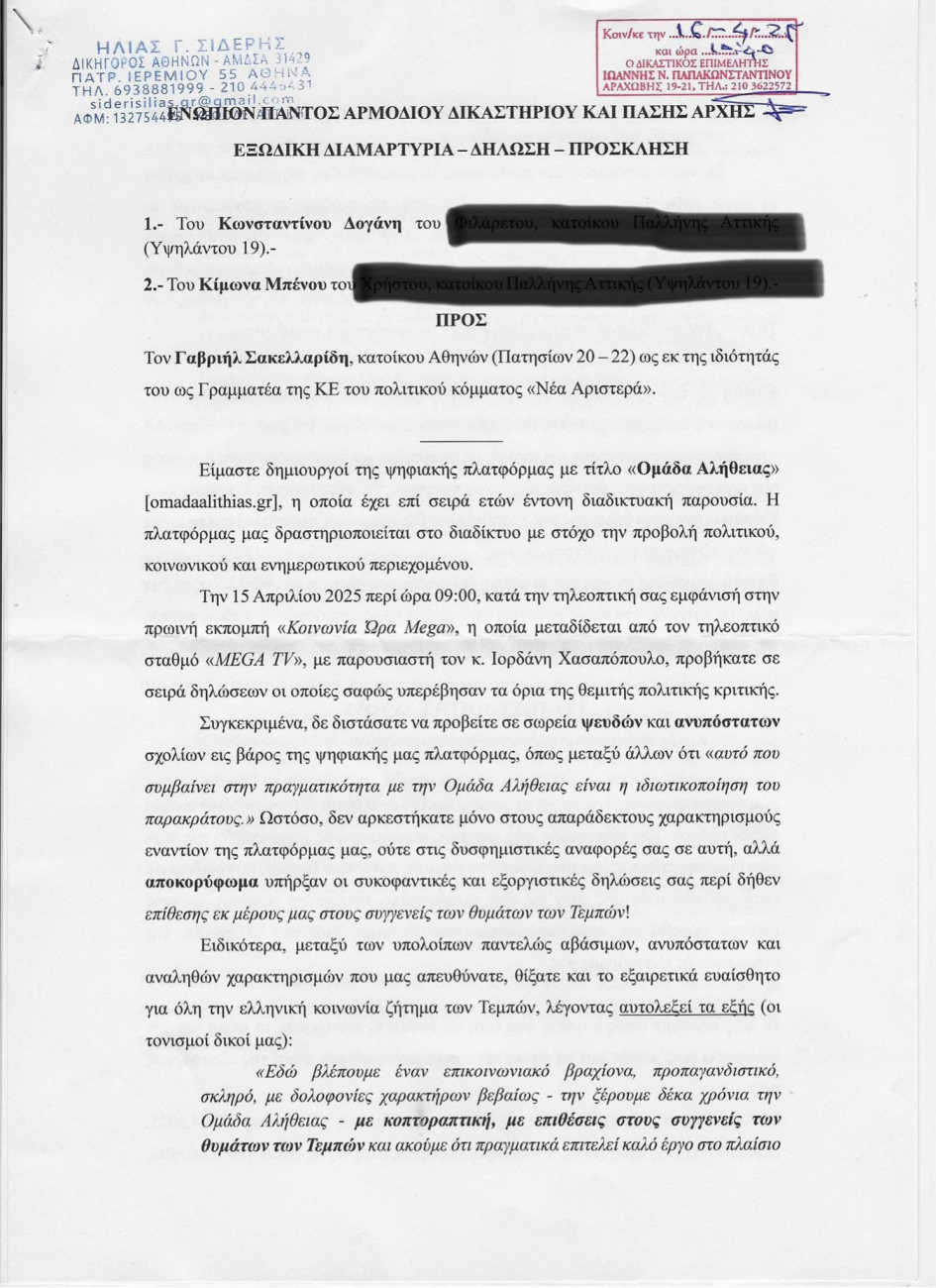 Την ώρα που η Ομάδα Αλήθειας να έχει αρχίσει να στέλνει εξώδικα σε πολιτικά στελέχη όπως ο Διονύσης Τεμπονέρας, ο Θανάσης Γλαβίνας και ο Γαβριήλ Σακκελαρίδης που υποστήριξαν ότι εμπλέκεται σε πρακτικές κομματικής παραπληροφόρησης, έχει ιδιαίτερο ενδιαφέρον το ποιος ήταν αυτός που υπογράφει τα εξώδικα ως πληρεξούσιος δικηγόρος.