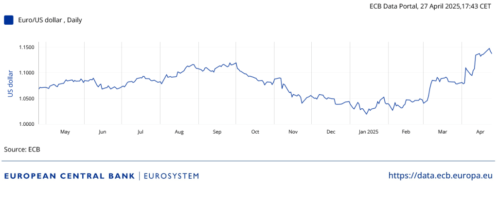 Το ενιαίο νόμισμα ενισχύεται πάνω από 10% έναντι του αμερικανικού από τις αρχές του τρέχοντος έτους με την ισοτιμία να φτάνει σε υψηλά τριετίας πριν από λίγες ημέρες, πάνω από τα 1,15 δολάρια. Το χαμηλότερο επίπεδο του ευρώ το τελευταίο δωδεκάμηνο ήταν τα 1,014 δολάρια και το υψηλότερο τα 1,157 δολάρια, ισοτιμία που καταγράφηκε στις 21 Απριλίου εν μέσω της αβεβαιότητας για τον πόλεμο δασμών.