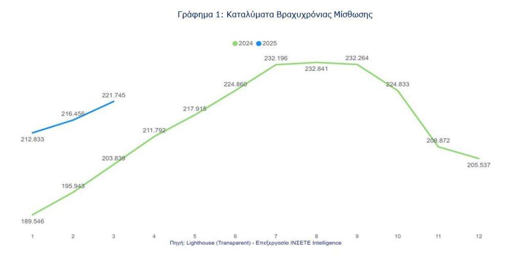 Ειδικότερα, η εξέλιξη του αριθμού των καταλυμάτων βραχυχρόνιας μίσθωσης κατά το Α’ τρίμηνο του 2025 δείχνει συνεχιζόμενη αύξηση σε σύγκριση με την αντίστοιχη περίοδο του 2024, διατηρώντας τη δυναμική που ξεκίνησε το 2023 και ενισχύθηκε εντός του 2024.